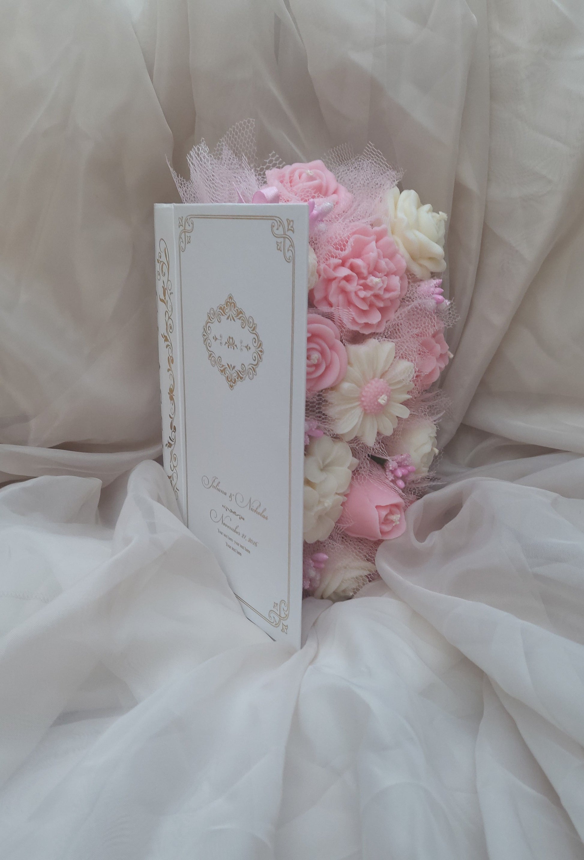 Handmade, delicate and fragrant bouquet of white and pink flowers in a book.